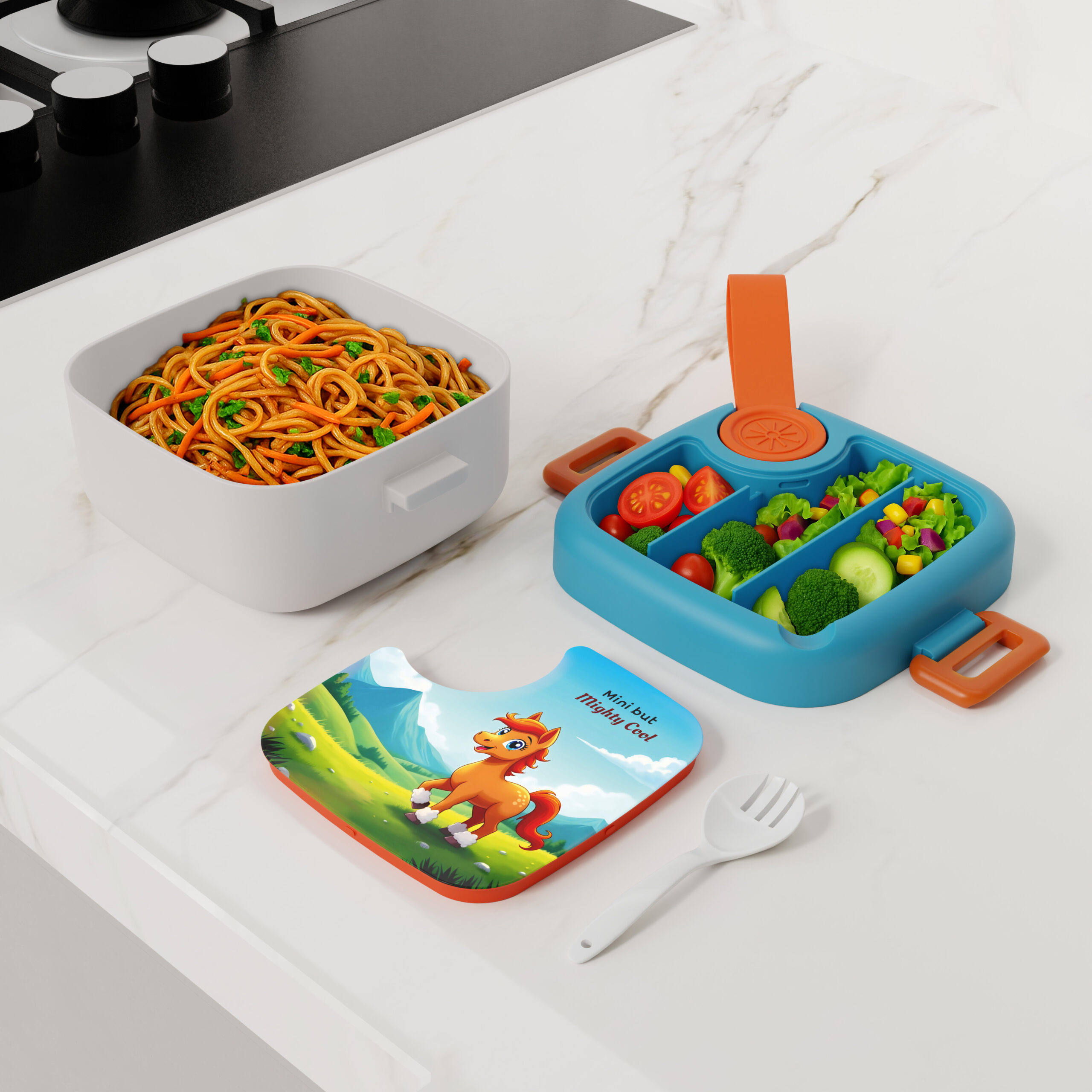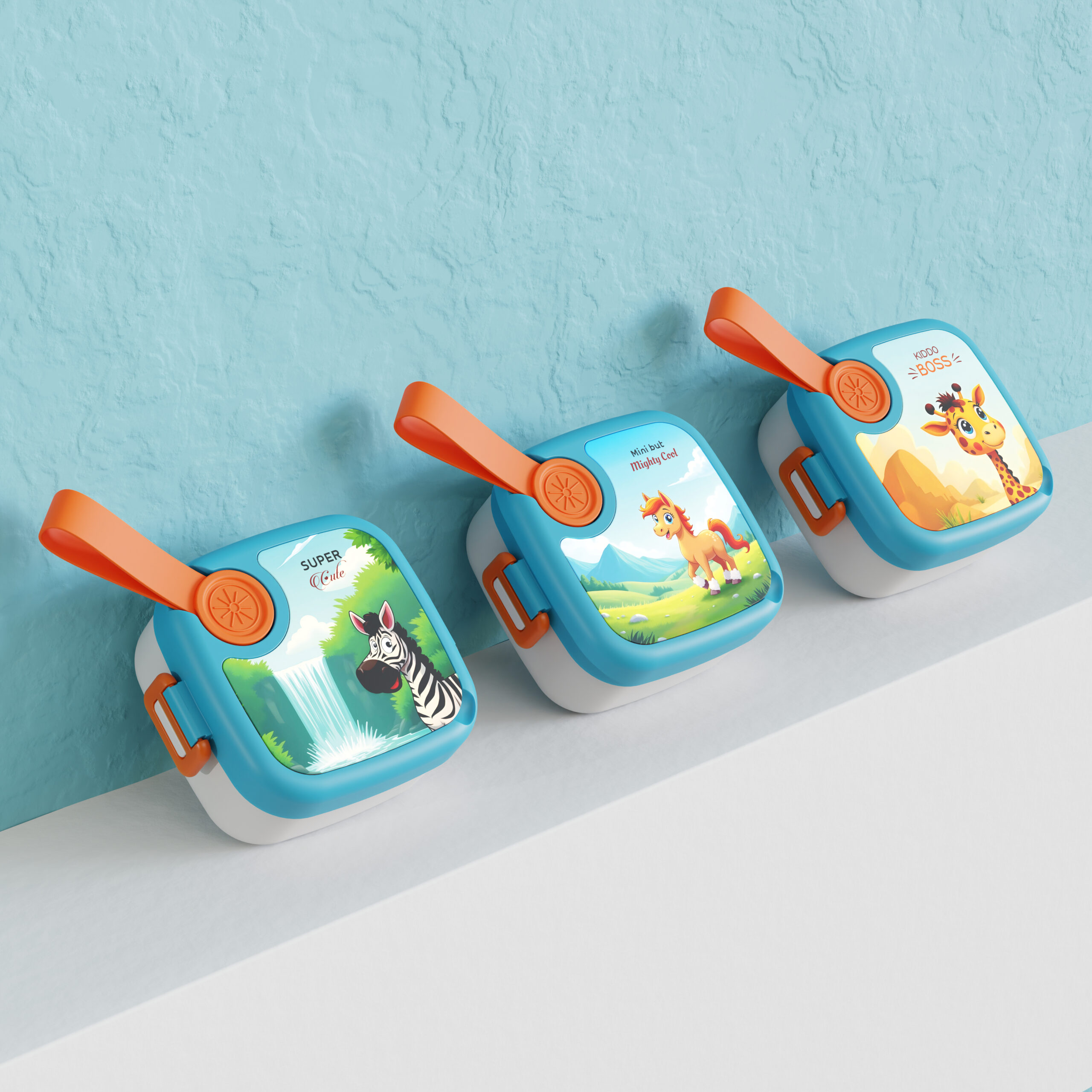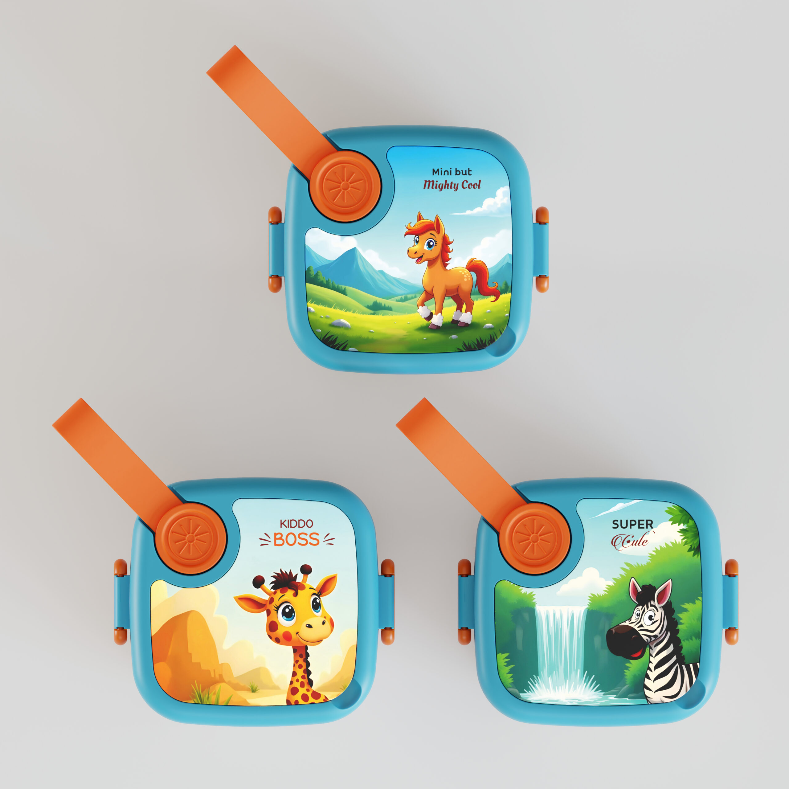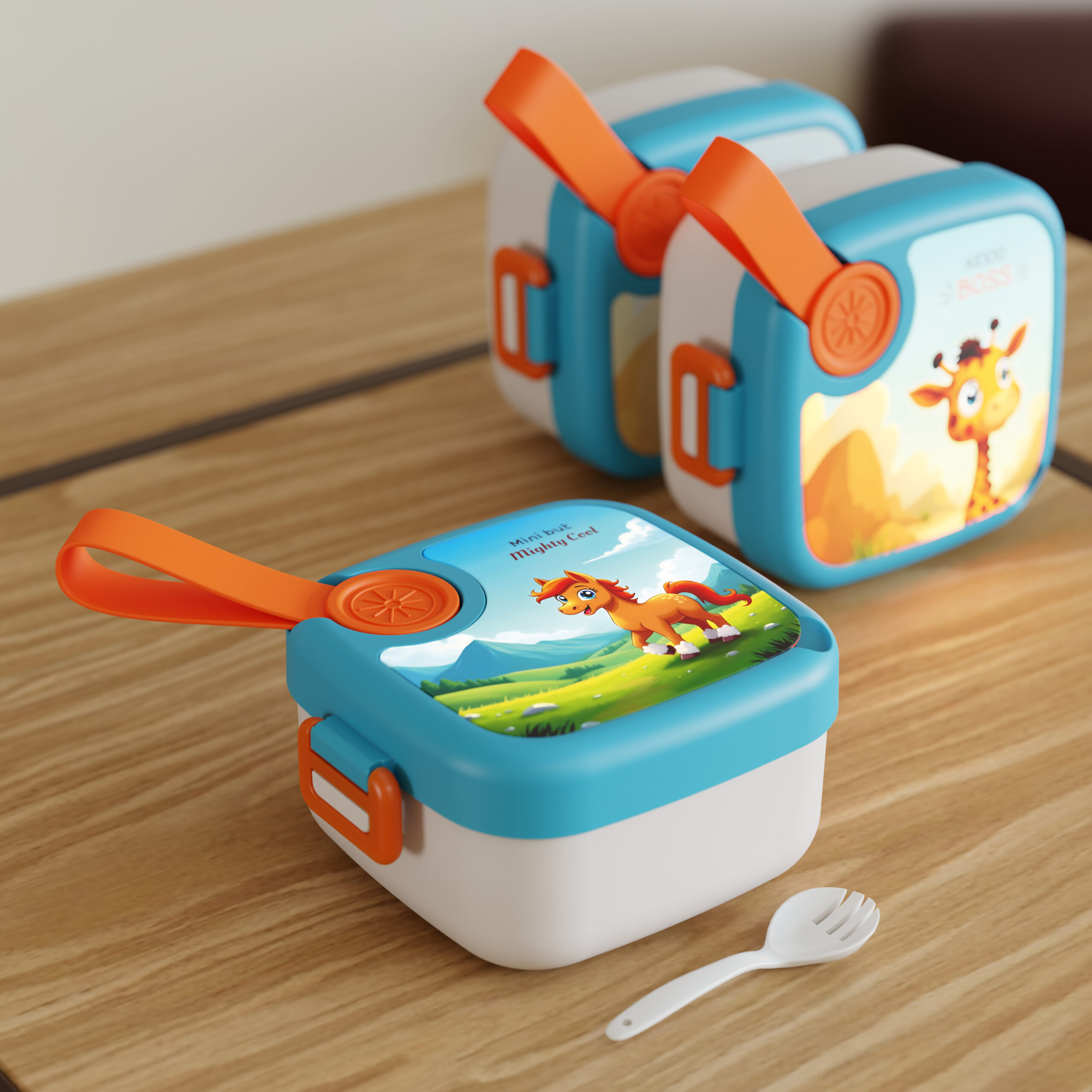 Brighten your child’s lunchtime with this playful zebra-themed bento lunch box set, featuring the cheerful phrase “Super Cute”. The set includes a sturdy white base container, a vibrant blue divided tray, and a colorful lid with a cute zebra graphic set against a scenic backdrop. Orange locking handles and a secure sealing mechanism ensure the box stays leakproof and mess-free. The included spoon is perfectly sized for little hands, making this lunch box ideal for school, outings, or picnics. Durable, easy to clean, and fun, this set keeps meals fresh and organized while adding a splash of color to every bite.