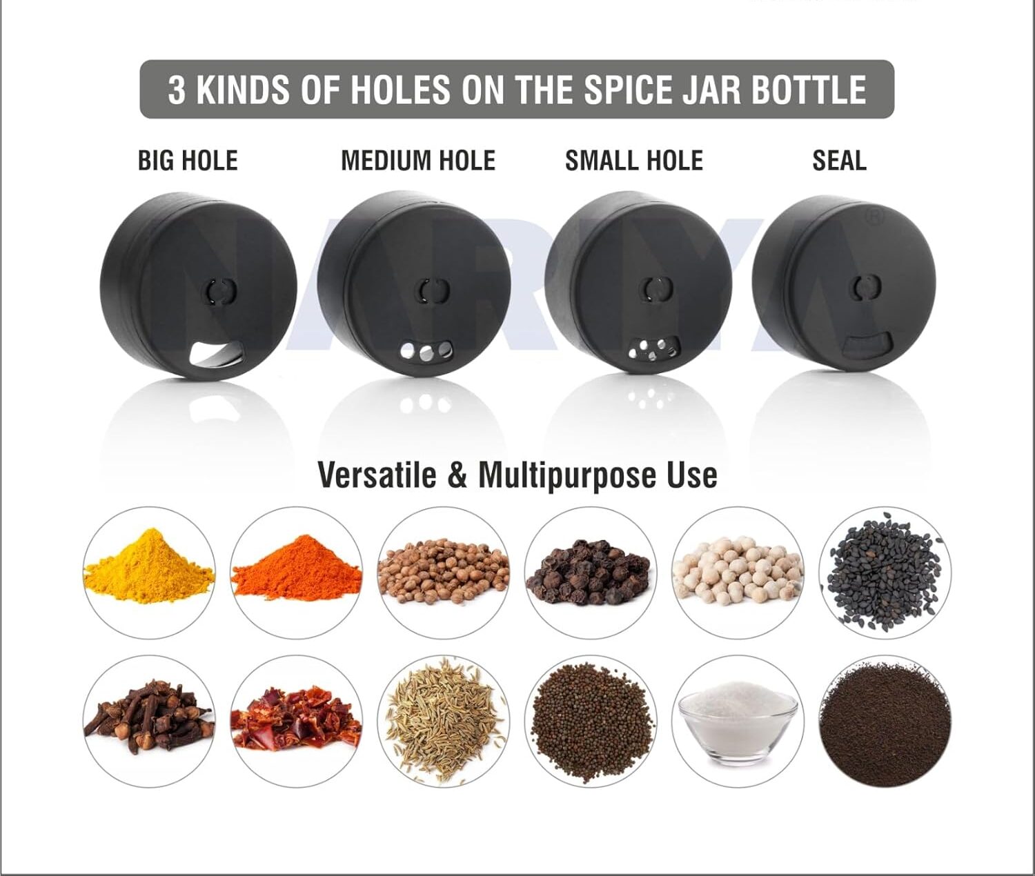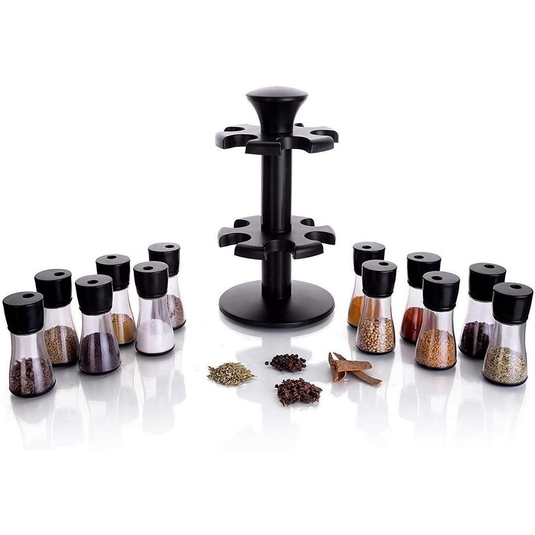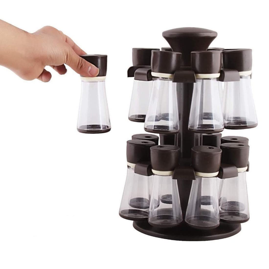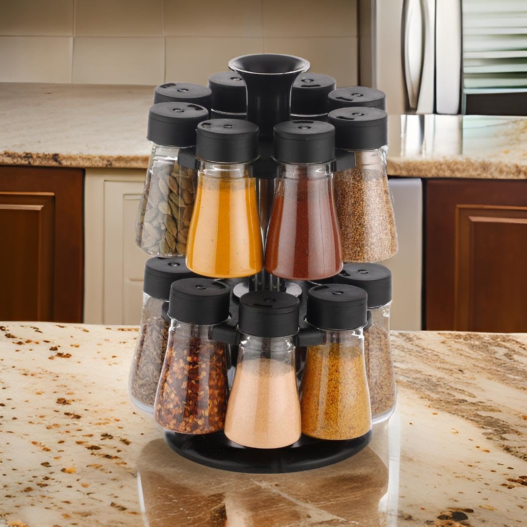 Plastic 360 Revolving Spice Container Set Of 16 Piece Seasoning Organizer Masala Countertop Rack Condiment Set For Kitchen Tiered Shelf (Transparent, 125Ml Each), Black cap